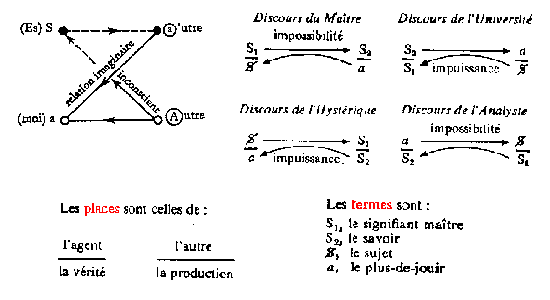 | "Schema L & formula of the Four Discourses" - comments: While the schema L (S-aa'-A) opens a topology (Real as a space dimension to find in Lacan's schema R), the linguistic chart displays another topos known as Art of Memory (see Yates, Bruno). At the present page, one shall notice that this Real implies the Artificial Intelligence factor (alias Cybernetics, which is another way to say Ecology (see definition of Ecology since 1950)). | ||
