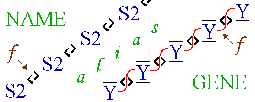 The 'f ' <2-link> (that I called elsewhere skewer) which points to this algorythm on the schema (above), indicates also the coil of the most selfish gene that Genetics discovered as the Y chromosome. For this father-to-son transmitted DNA passes through the male bodies along Time and generations, as the METONYMIC through the fantasm - alias as the PATRONYMIC through the filiation (body chain) - [NOTE the patronymic is then after represented in Metaphor]