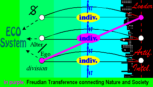 The following view shows the Freudian framework. The fundamental principle of Transference joins the three ontological categories (bio., psycho., socio.; alias being, indiv., mass). It pulls back the ideal of leadership (expert) to an 'alter/ego' relationship while concurrently backing it up to Expert Systems (Artificial Intelligence, alias Cybernetics).