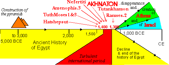 Akhnaton had initiated a new monotheistic religion and promoted a social revolution in Egypt. He brought his country on the verge of a catastrophy then suddenly and mysteriously disappeared. His empty tomb underscores the covering up of his memory by his successor Ramses II. AKHNATON was erased from all Egyptian historical records and it was forbidden to mention his name. At this time MOSES appeared on the historical stage in the Sinai (around 1300 b.c.e).