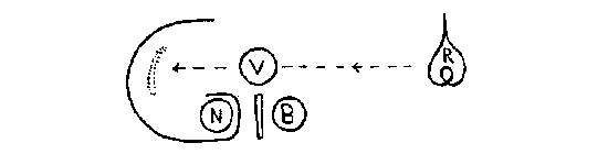 | "Plato's Cave - in The Republic" - comment: A source of light (R) casts inside a cave the shadow of a Letter (V) carried by actors (B); this projection provides the reality for a crowd (N). It is easy to show that the traditional Model of The Republic, divulgued by Plato when Socrate's condamnation announced the end of Athen's cycle, is carried again by Lacan in its Optical Model in Psychoanalytical Phase (below): | ||