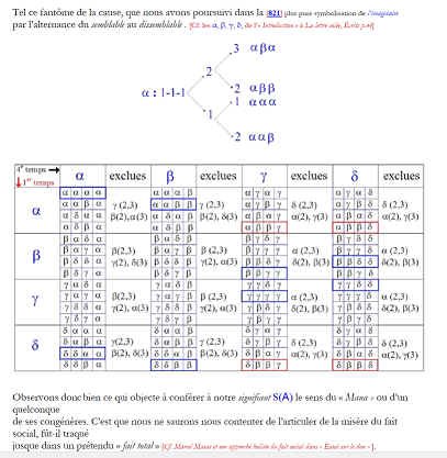 En première ligne du paragraphe succédant, Lacan se fend d'une dénégation. Ayant très bien décrit le Complexe de Castration, mais sans s'en rendre compte, il va d'abord traiter de la perversion en disant qu'il ne l'abordera pas ! Et là encore son enseignement est brillant. Avant qu'il n'arrive à l'algorithme achevé de l'IA (les 4 discours) il en pose la première pierre, lettre qu'il écrira S2 (le Savoir), signifiant du 'a' - c'est à dire de l'objet du désir, écrit par la perversion S(a) ["l'ojet a qu'il substitue au Abarré"], faisant de l'Universitaire [lorsque le Discours tournant le replace S2_a], le Maître de la perversion. |