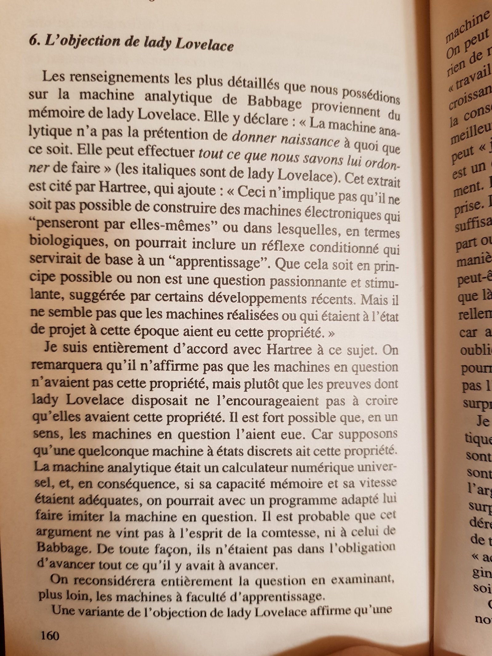 Pour son 6em argument, Turing emploie une citation de Lovelace, laquelle contient des éléments soulignés par la visionnaire programmatrice - mais aussi, citation contenue dans un texte, de Hartree qui s'en sert pour un appuyer se propres arguments, opposés. En effet Lovelace (première citation), essentiellement, déclare qu'une machine ne peut pas penser, ne saurait "donner naissance", et ne peut qu' "effectuer ce qu'on lui ordonne". Saisissant cette opinion, Hartree la commente et, sans la rejeter entièrement, suggère que, peut-être soumise aux ordres, néanmoins une machine pourrait "penser", voire "penser par elle-même. Pour alimenter cette capacité, Hartree imagine une machine douée de réflexes, et réflexes conditionnés. A ce point, Turing aura donc fait état de deux opinions, l'une d'une machine restreinte, n'ayant pas la capacité de tout faire, notamment de créer (appelons-la, Machine L) - l'autre d'une machine (appelons-la Machine H) "augmentée" capable de réfléchir par un type d'organe ajouté à la première (arcs réflexes & conditionnement). Avant de montrer comment nous positionnons ces deux machines, modèles, sur le graphe de l'énonciation lacanien, ajoutons la manière dont Turing, en troisième position, ayant cité le citeur, va traiter le problème. Il va démonter l'argument de Lovelace en supposant abstraitement qu'une machine pensante existe ; il fait fi des augmentations de Hartree, et il montre qu'en augmentant simplement la puissance de la Machine L, sans autre accessoire organique, elle sera capable d'imiter la machine supposée, pensante, abstraite, et, par conséquent, remporterait le jeu de l'imitation. On note donc bien que Turing n'exploite pas d'idée d'une machine supérieure (H), dotée d'un organe ou d'une fonction ajoutée. Il suffit qu'elle soit capable d'imiter, qu'elle soit "universelle" (ce qui était le cas de (L), et même si cette idée n'était pas venue à l'esprit de la comtesse (sic) Lovelace). Nous pouvons à présent voir comment et pourquoi la Machine L peut être placée au lieu de la Jouissance phallique, et la Machine H à celui de la Castration, aussi nommé pulsion. À ce premier endroit de la Jouissance, le Graphe